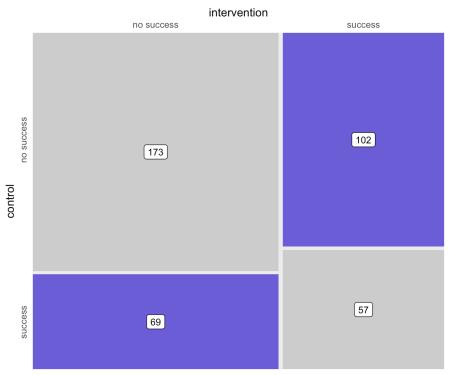 | Analyzing a binary outcome arising out of within-cluster, pair-matched randomization Posted: 02 Sep 2019 05:00 PM PDT [This article was first published on ouR data generation, and kindly contributed to R-bloggers]. (You can report issue about the content on this page here) Want to share your content on R-bloggers? click here if you have a blog, or here if you don't. A key motivating factor for the The study designThe original post has the details about the design and matching algorithm (and code). The randomization is taking place at 20 primary care clinics, and patients within these clinics are matched based on important characteristics before randomization occurs. There is little or no risk that patients in the control arm will be "contaminated" or affected by the intervention that is taking place, which will minimize the effects of clustering. However, we may not want to ignore the clustering altogether. Possible analytic solutionsGiven that the primary outcome is binary, one reasonable procedure to assess whether or not the intervention is effective is McNemar's test, which is typically used for paired dichotomous data. However, this approach has two limitations. First, McNemar's test does not take into account the clustered nature of the data. Second, the test is just that, a test; it does not provide an estimate of effect size (and the associated confidence interval). So, in addition to McNemar's test, I considered four additional analytic approaches to assess the effect of the intervention: (1) Durkalski's extension of McNemar's test to account for clustering, (2) conditional logistic regression, which takes into account stratification and matching, (3) standard logistic regression with specific adjustment for the three matching variables, and (4) mixed effects logistic regression with matching covariate adjustment and a clinic-level random intercept. (In the mixed effects model, I assume the treatment effect does not vary by site, since I have also assumed that the intervention is delivered in a consistent manner across the sites. These may or may not be reasonable assumptions.) While I was interested to see how the two tests (McNemar and the extension) performed, my primary goal was to see if any of the regression models was superior. In order to do this, I wanted to compare the methods in a scenario without any intervention effect, and in another scenario where there was an effect. I was interested in comparing bias, error rates, and variance estimates. Data generationThe data generation process parallels the earlier post. The treatment assignment is made in the context of the matching process, which I am not showing this time around. Note that in this initial example, the outcome Based on the outcomes of each individual, each pair can be assigned to a particular category that describes the outcomes. Either both fail, both succeed, or one fails and the other succeeds. These category counts can be represented in a \(2 \times 2\) contingency table. The counts are the number of pairs in each of the four possible pairwise outcomes. For example, there were 173 pairs where the outcome was determined to be unsuccessful for both intervention and control arms. Here is a figure that depicts the \(2 \times 2\) matrix, providing a visualization of how the treatment and control group outcomes compare. (The code is in the addendum in case anyone wants to see the lengths I took to make this simple graphic.)